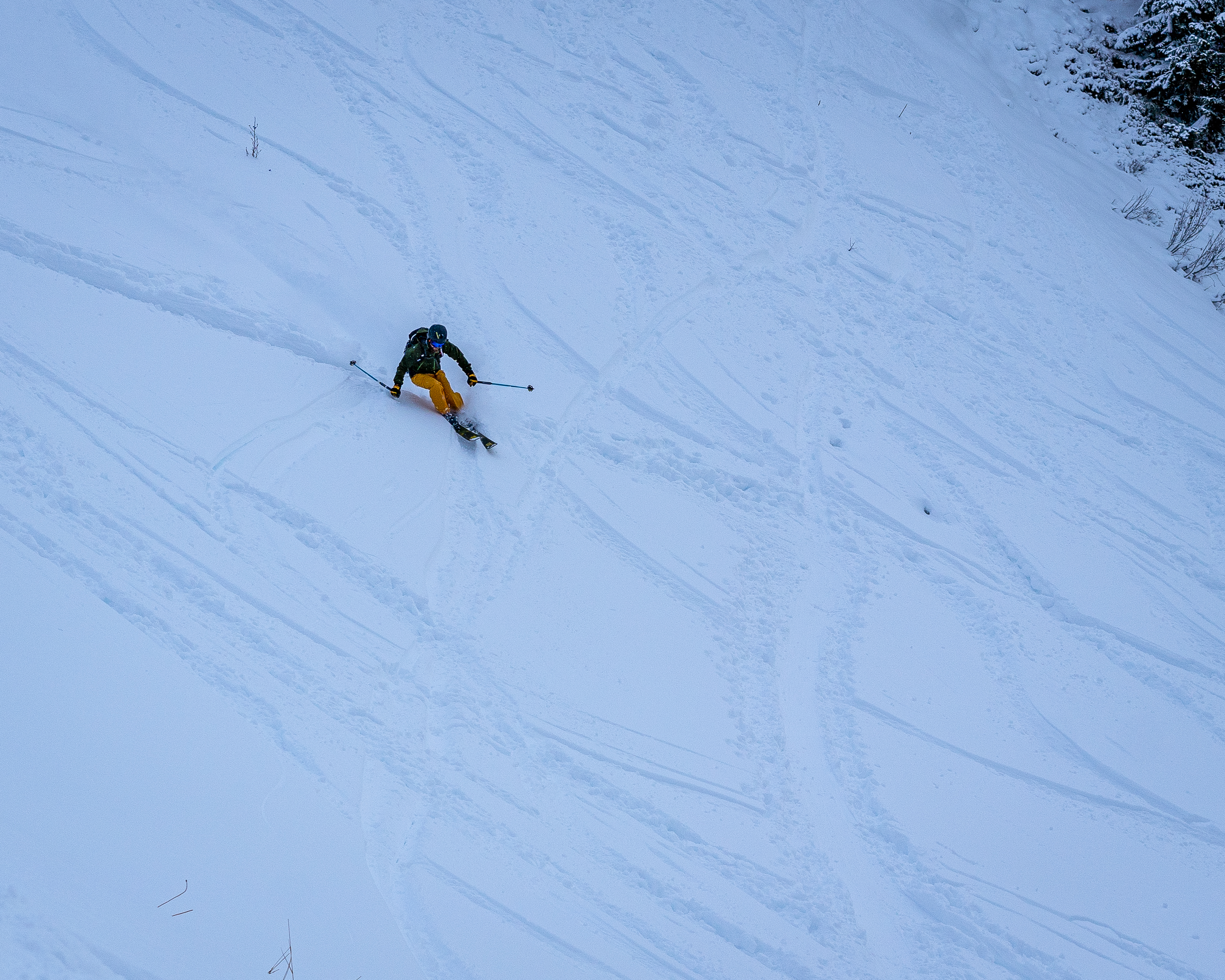 Ist man nach einem langen Aufstieg oben angekommen und hat einen Hang mit 50 cm Powder oder mehr vor sich, weiß man, warum man sich mit einem eher schweren Schuh- und Bindungs-Setup hinauf gequält hat. Hier ist der Corbets 110 zu Hause – Pulverschnee in allen Variationen.