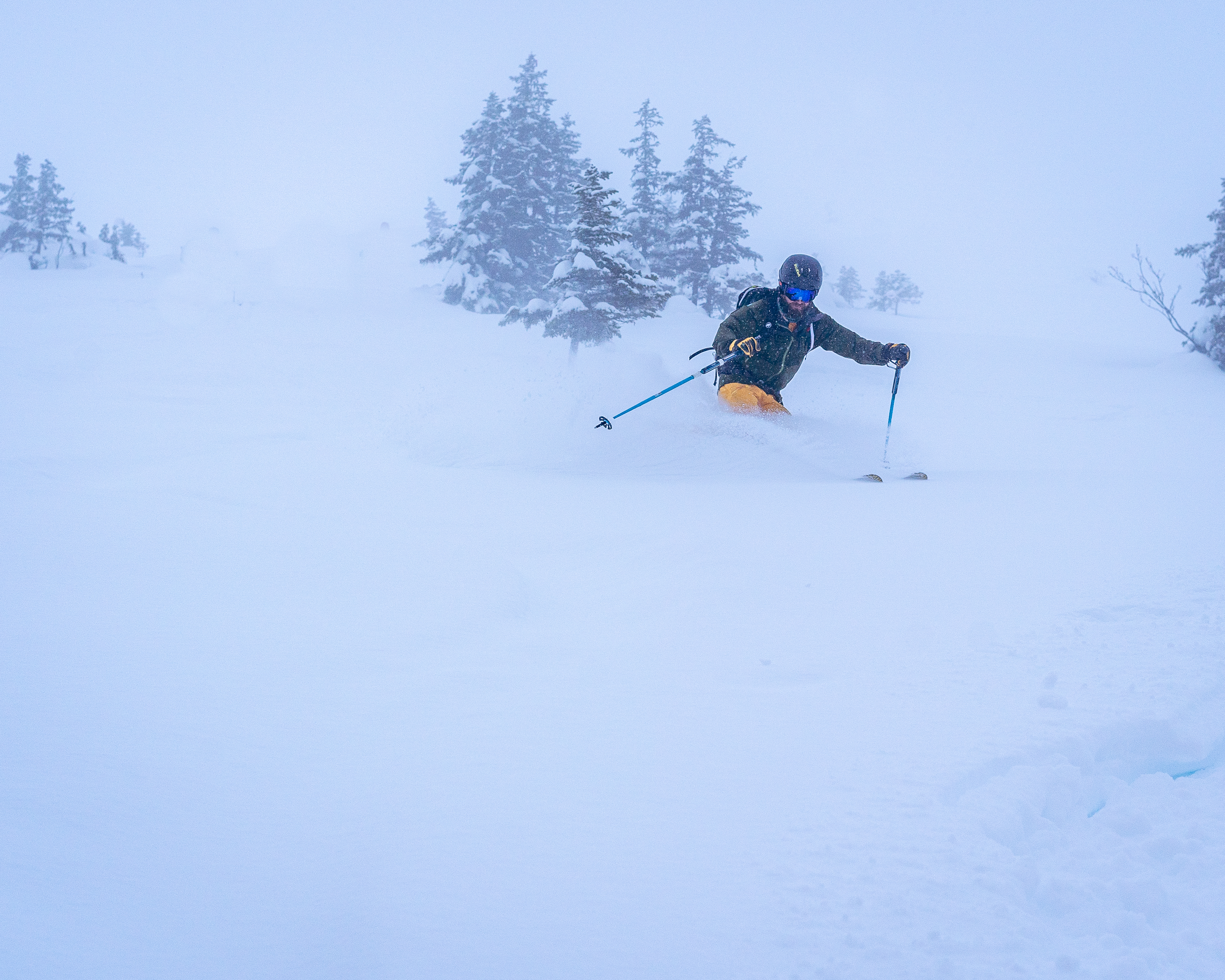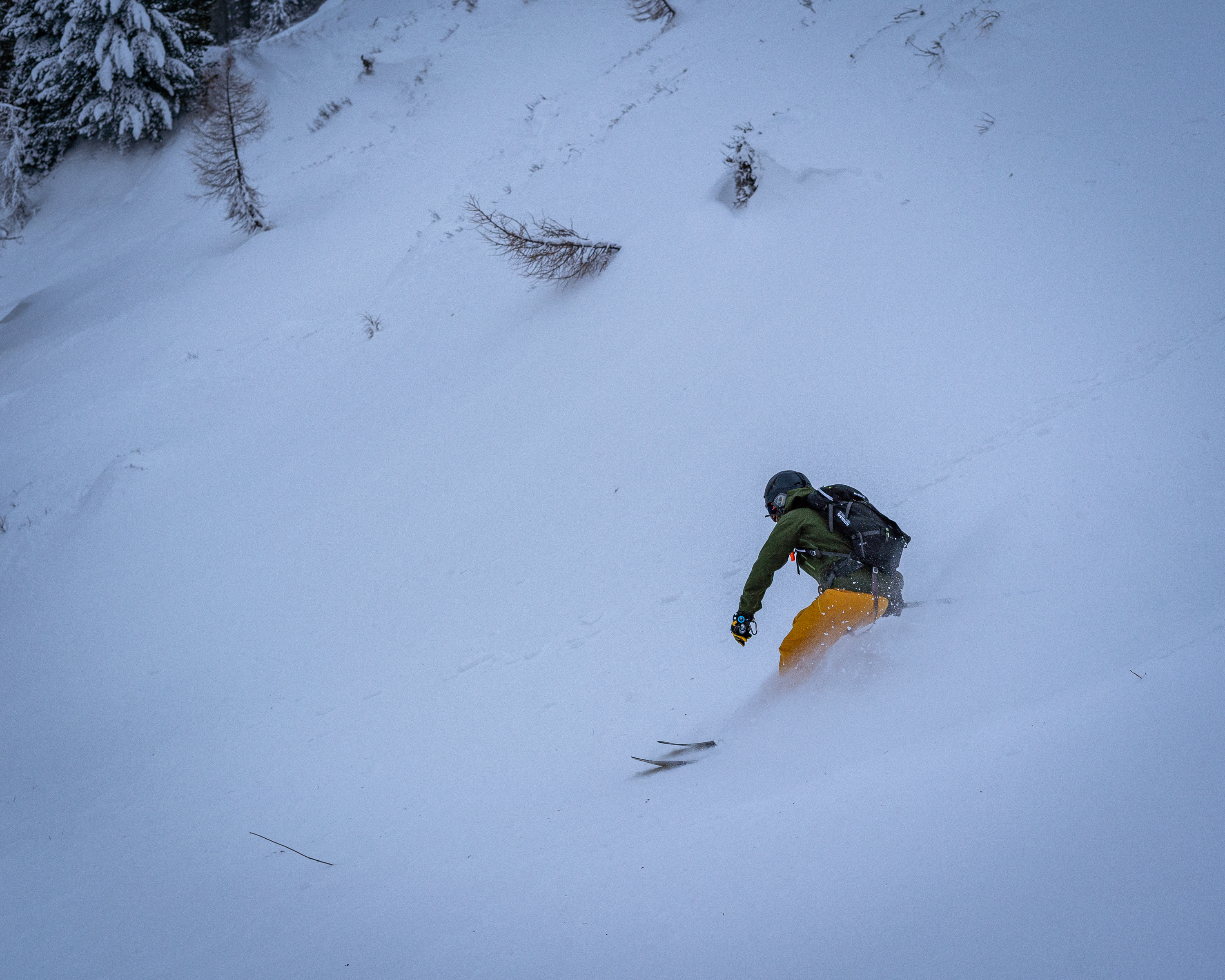 Erreicht man eine gewisse Geschwindigkeit und eine gewisse Steilheit, liegt er auch bei höherem Tempo für sein Gewicht sehr ruhig im Schnee und macht alles was man will, ohne dass es wirklich anstrengend wäre. Man surft förmlich über dem Schnee dahin.