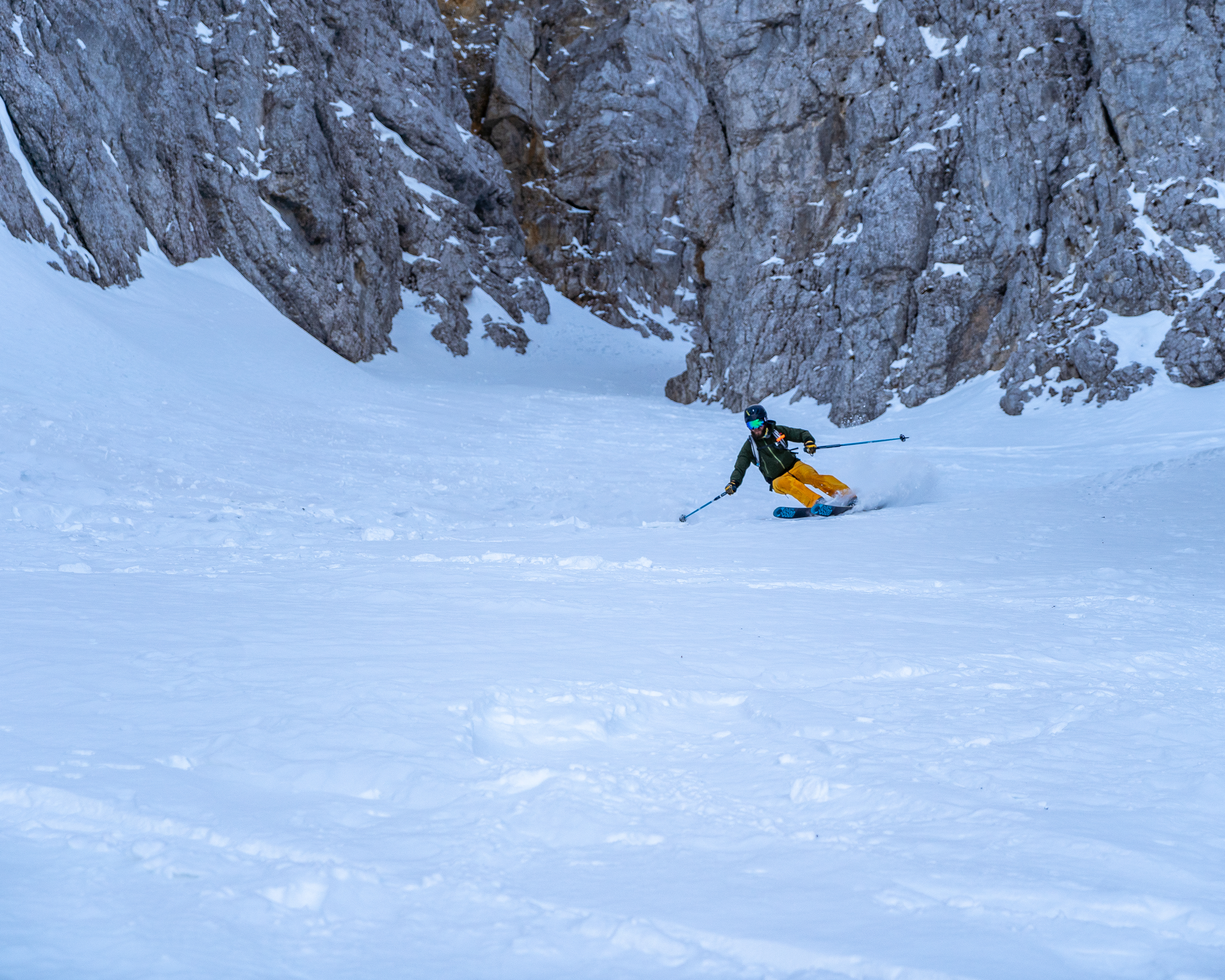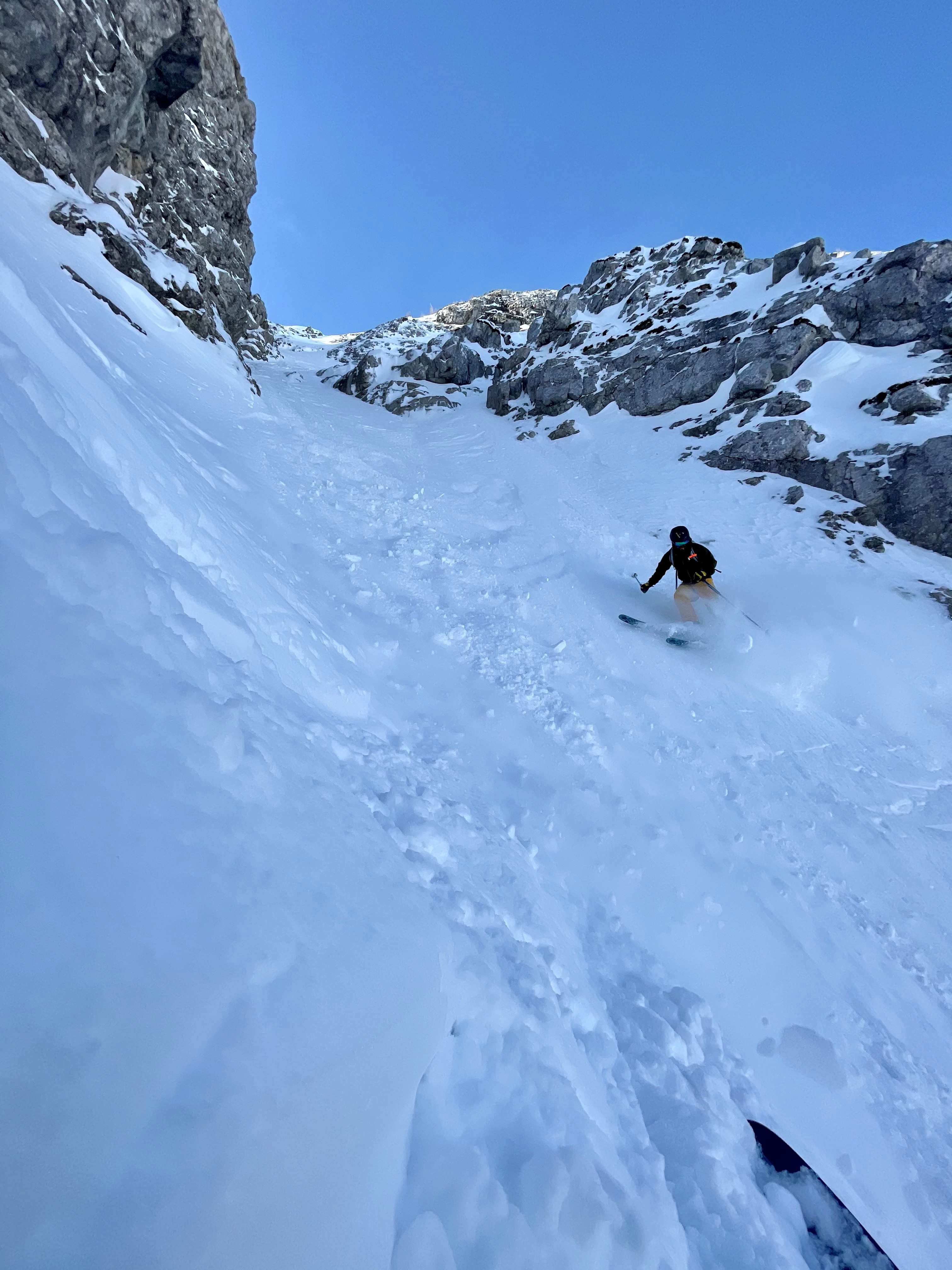 Gut, eine 50° Rinne ist eventuell nicht der beste Ort, um einen neuen Ski zu testen, zeigt aber vielleicht, welches Vertrauen ich in diesen Ski lege, sodass ich, ohne zu zögern eine so fordernde Abfahrt für die ersten Schwünge wählte.